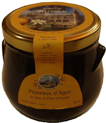 Pruneaux au sirop de fleur d’orangeren bocal verre 850 ml A servir avec une boule de glace vanille pour un dessert facile et original.