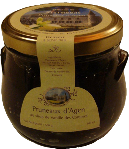 Pruneaux au sirop de vanille des Comoresen bocal verre 850 ml A servir avec une boule de glace vanille pour un dessert facile et original.